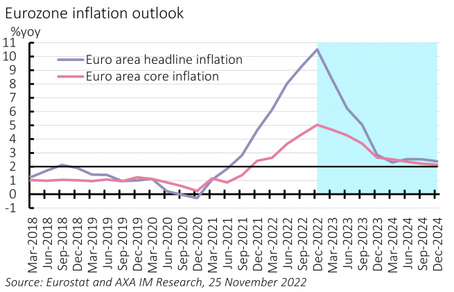 Die EZB hat den Einlagensatz dieses Jahr in nur drei Sitzungen um 200 Basispunkte auf 1,5% angehoben. Wie der Markt rechnen wir mit einer weiteren Erhöhung um 50 Basispunkte im Dezember. Da die Inflation voraussichtlich fällt und die Geldpolitik restriktiv wird, dürften die größten Zinserhöhungen hinter uns liegen. Das heißt aber nicht, dass es in der EZB jetzt keine Falken mehr gibt. Wir glauben, dass die Notenbank den Einlagensatz auch im Februar und März anhebt, allerdings nur noch um jeweils 25 Basispunkte auf dann 2,5%. Sie läge damit ein Stück unter dem vom Markt erwarteten Zinsmaximum von 2,9% Mitte 2023. Aber auch damit ist die Geldpolitik noch restriktiv.