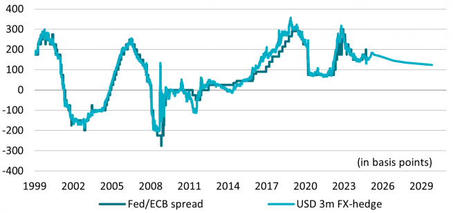 Nun aber dürften die Kosten der Dollar-Absicherung steigen, da sich das geldpolitische Gefälle zwischen der US-Notenbank und der EZB im Laufe des Jahres 2025 voraussichtlich weiten wird. Das Diagramm zeigt das Verhältnis zwischen den offiziellen Leitzinsen und den Kosten für die Absicherung des Währungsrisikos. So impliziert der prognostizierte Kurvenverlauf bereits bis März 2025 einen Anstieg der Absicherungskosten um rund 30 Bp, bevor sich Letztere über den Dreijahreszeitraum auf 130 Bp einpendeln dürften.
