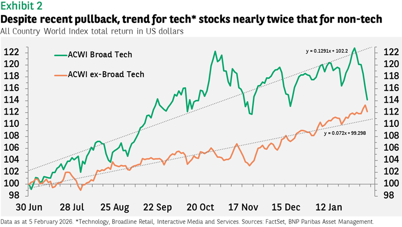 Die Gewinnerwartungen für Technologieaktien mögen nachlassen, dürften aber noch immer deutlich über denen anderer Aktien liegen. Zurzeit wird für den Technologiesektor ein Gewinnwachstum von 31% in diesem Jahr erwartet, gegenüber nur 10% bei anderen Aktien. 2025 waren es 26% und 6%. Wegen des großen Abstands dürfte es anderen Titeln schwerfallen, Technologieaktien nachhaltig hinter sich zu lassen – es sei denn, der Gewinnausblick für den Technologiesektor verschlechtert sich stark oder die Bewertungen fallen deutlich.