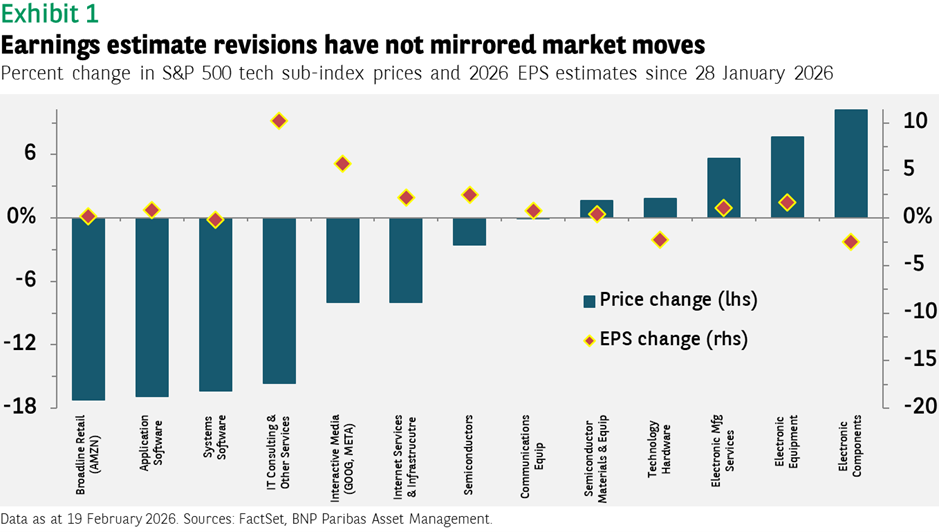 Es scheint fast sicher, dass manche Firmen die technologischen Umwälzungen nicht überstehen werden (Ruht in Frieden, Napster und Blackberry). Und doch fragt man sich, ob die jüngsten Kursverluste nicht übertrieben sind. Die S&P-500-Teilindizes für Anwendungssoftware und Systemsoftware sind seit Ende Januar um 16% gefallen, aber die Gewinnschätzungen für 2026 wurden kaum gesenkt (Abbildung 1).