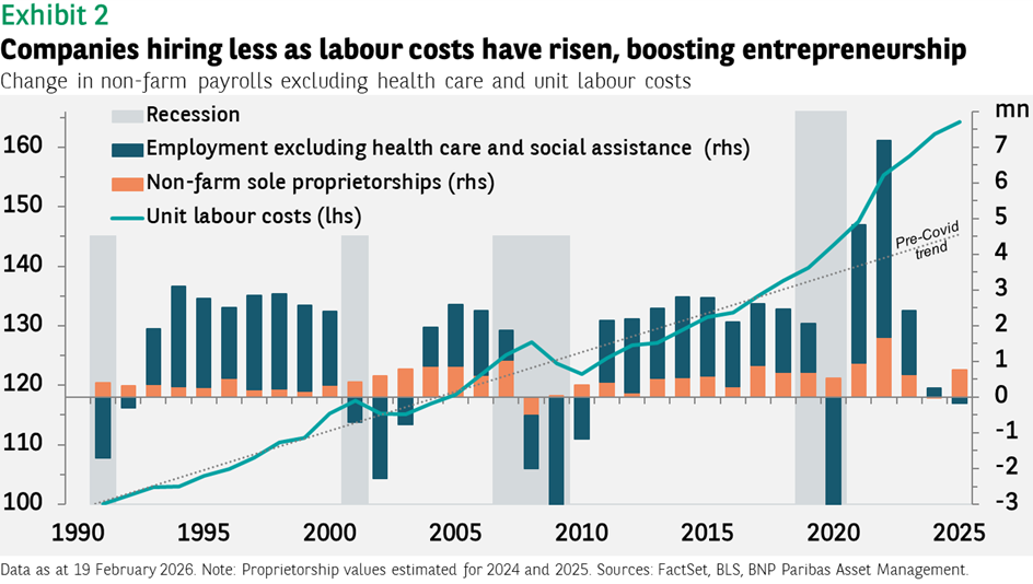 Aber was tun die entlassenen Mitarbeiter und auch Berufsanfänger, wenn sie nicht im Gesundheitssektor arbeiten? Zumindest einige haben ihr eigenes Unternehmen gegründet. Wir schätzen, dass die Zahl der Einzelunternehmen (also solche, die keine Kapitalgesellschaften sind und von einem Inhaber geführt werden – etwa Freelancer oder Influencer) 2025 um etwa 800.000 gestiegen ist. Da könnte erklären, warum die Arbeitslosenquote mit zurzeit 3,9% bei Erwachsenen trotz steigender Erwerbspersonenzahl noch immer so niedrig ist.