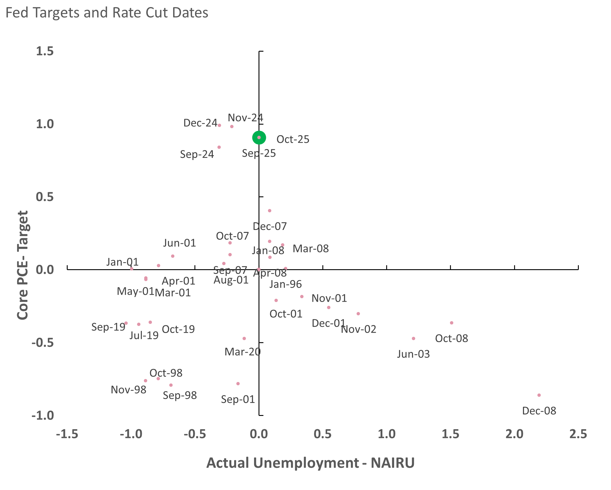 Bei dieser leichten Änderung der Erwartungen geht es vor allem um das Timing, der Umfang bleibt unverändert. Nach wie vor wird für Ende 2026 mit einer Federal Funds Rate von 3,0% gerechnet, aber das scheint mir noch nicht ausgemacht. Es ist unklar, ob die derzeitige Lage der US-Wirtschaft wirklich weitere Zinssenkungen rechtfertigt. Die Fed hat ein doppeltes Mandat: Sie muss für Preisstabilität ebenso sorgen wie für Vollbeschäftigung. Abbildung 1 verdeutlicht das. Die y-Achse zeigt die Differenz zwischen der PCE-Kerninflation und dem 2%-Inflationsziel der Fed; Werte über null stehen dabei für eine Teuerung über dem Zielwert. Die x-Achse zeigt das Gleiche für die Arbeitslosenquote. Sie vergleicht den tatsächlichen Wert mit der NAIRU, der Non-Accelerating Inflation Rate of Unemployment, die nach Einschätzung des Congressional Budget Office zu einer stabilen Inflationsrate führt. Werte unter null stehen für eine Arbeitslosigkeit unter der NAIRU, also für Arbeitskräftemangel. Die Punkte stehen für alle Monate seit 1995, in denen die Fed die Zinsen gesenkt hat.