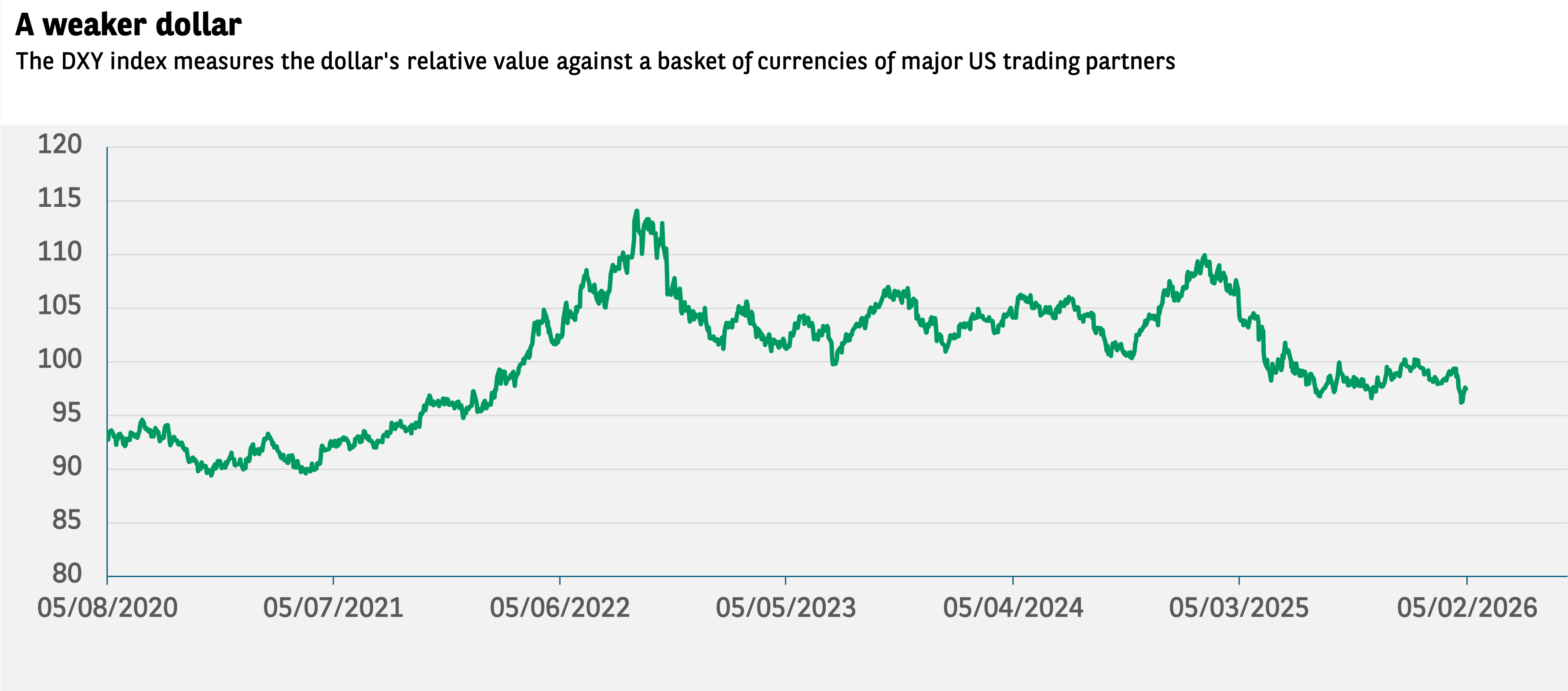 Der US-Dollar-Index (DXY) gibt den Wert des Greenback gegenüber einem Korb aus Währungen von Handelspartnern der USA wieder. Wenn der Dollar gegenüber den anderen Währungen abwertet, sinkt der Index. In den zwölf Monaten bis Januar ist er um 10% gefallen. Bei Anlegern ist eine Diversifizierung weg vom Dollar zu beobachten. Auslöser sind Bedenken wegen der Wirtschaftspolitik der US-Regierung, aber auch der Wunsch, Chancen außerhalb der weltweit größten Volkswirtschaft zu nutzen und ausgewogene Portfolios weiter zu diversifizieren.
