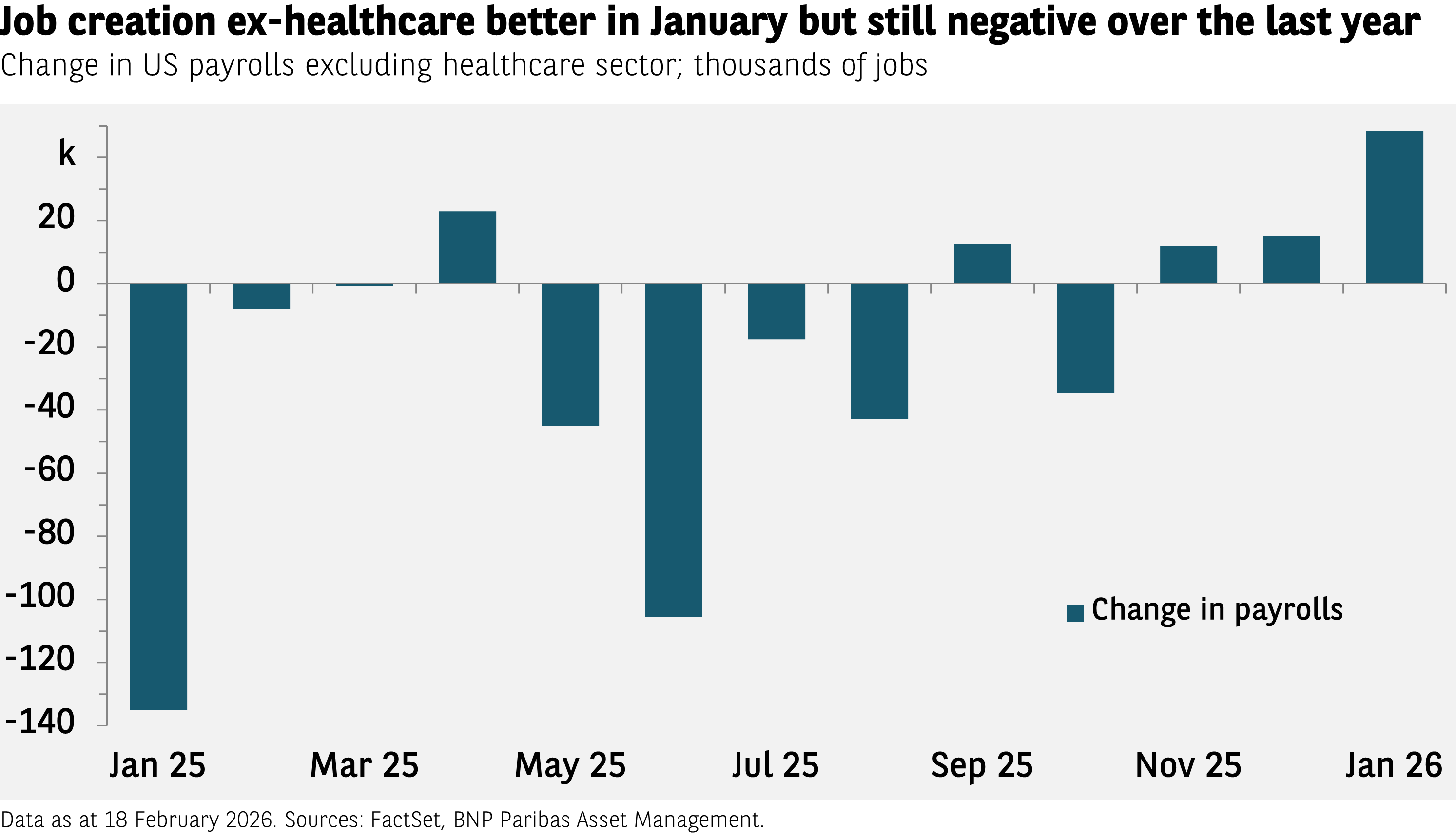 Die jüngsten Arbeitsmarktdaten konnten die Zweifel am Beschäftigungswachstum in den USA zerstreuen. Unter Ausklammerung des Gesundheitssektors (in dem seit Jahren sehr viele neue Stellen geschaffen werden) entstanden im Januar 49.000 neue Arbeitsplätze. Insgesamt war der Beschäftigungszuwachs im vergangenen Jahr dennoch rückläufig. Manche Anleger sehen im Stellenabbau ein Zeichen für eine schwächelnde US-Wirtschaft. Aus unserer Sicht belegt er hingegen deren Stärke: Das BIP steigt, jedoch wird die Wertschöpfung von weniger Arbeitskräften erwirtschaftet – ein Nachweis für einen Anstieg der Produktivität. Was aus den entlassenen Arbeitnehmern wird? Viele von ihnen machen sich selbständig. Nach unserer Schätzung wurden letztes Jahr 800.000 Einzelunternehmen gegründet.