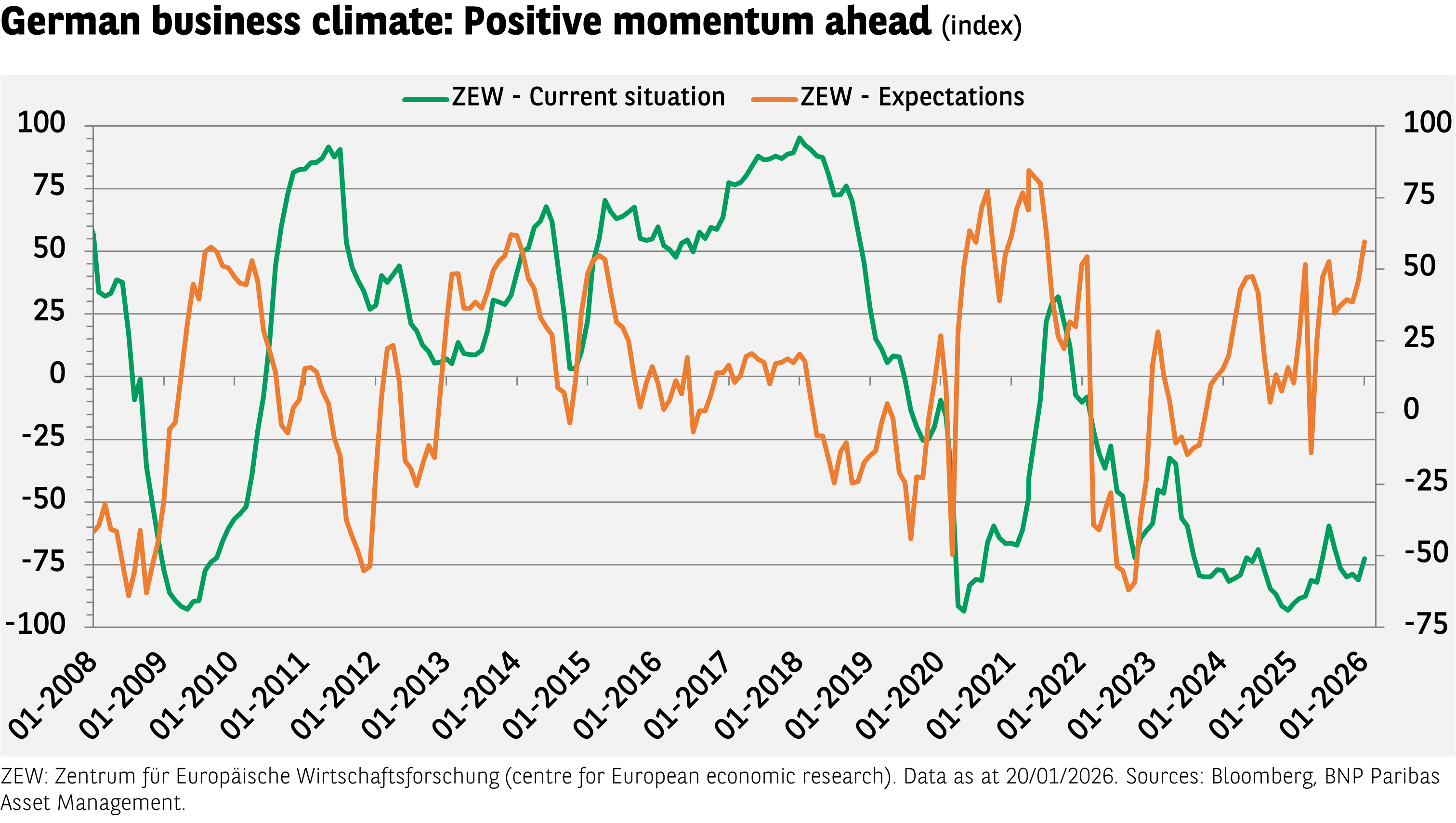 Die ZEW-Konjunkturerwartungen, die sich auf eine Befragung deutscher Finanzanalysten und Anleger stützen, ist im Januar deutlich und auf ihren höchsten Stand seit Juli 2021 gestiegen. Dies weckte Hoffnungen auf eine neue Dynamik, die von einem geplanten massiven Ausbau der Infrastruktur- und Verteidigungsausgaben getragen wird. Die Auftragsbücher füllen sich, und die Industrieproduktion lag zum Jahresende 2025 deutlich über den Erwartungen. Zuversichtlich stimmt auch, dass sich die Einschätzung der aktuellen Wirtschaftslage verbessert hat, wenn auch weniger stark. Ist es womöglich jetzt an der Zeit, stärker auf Deutschlands Potenzial zu vertrauen?
