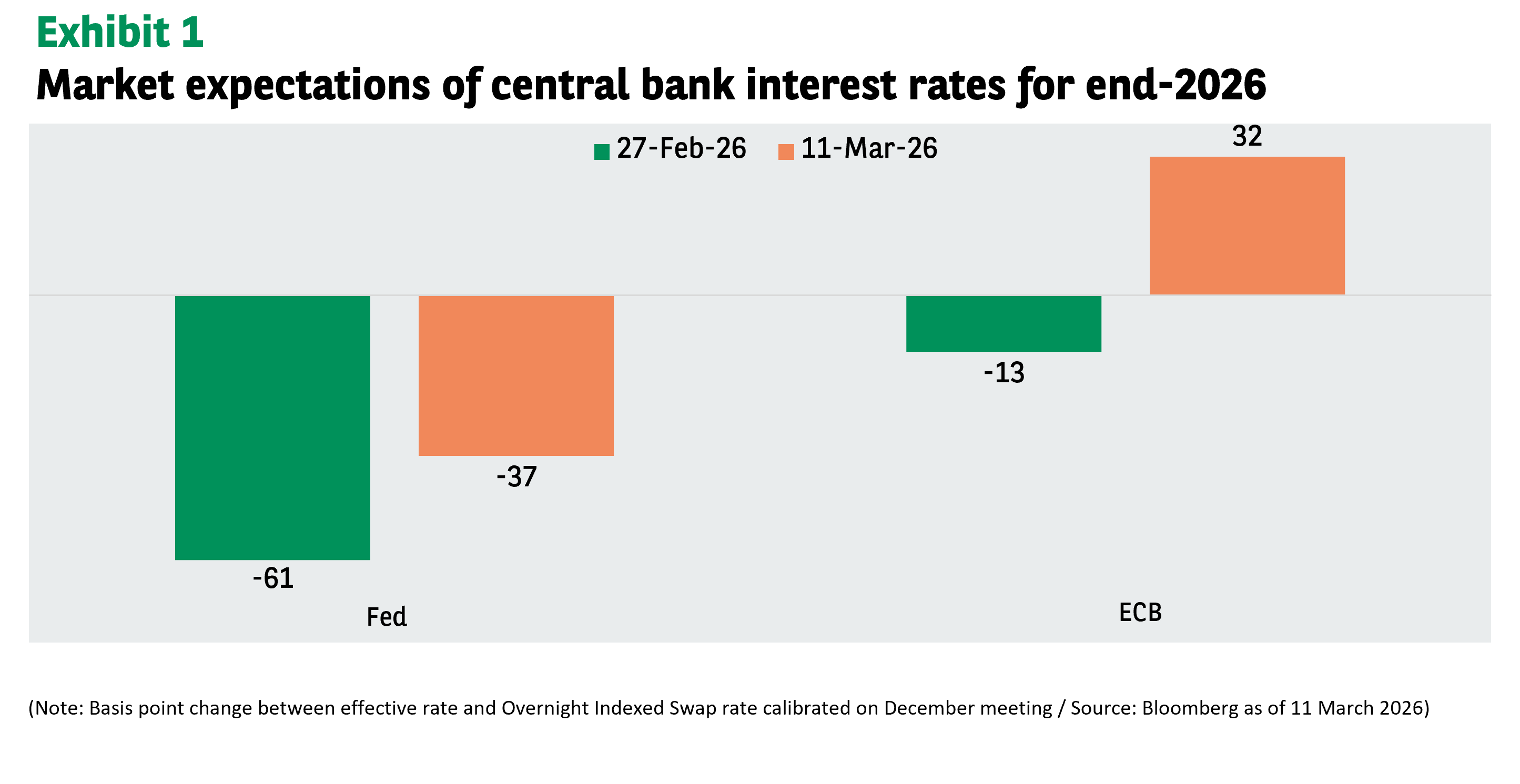 Der Nahostkonflikt hat erhebliche Anpassungen der geldpolitischen Erwartungen erzwungen. Vor Beginn des Militärschlags hatte der Markt mehr als zwei Fed-Zinssenkungen um 25 Basispunkte im laufenden Jahr sowie eine Lockerung seitens der Europäischen Zentralbank um rund 13 Basispunkte eingepreist. Inzwischen werden jedoch von der Fed und der EZB Senkungen um insgesamt 37 bzw. Zinsanhebungen von über 30 Basispunkten erwartet. Das Hauptproblem ist die Inflation: Je länger der Ölmarkt weltpolitischen Risiken ausgesetzt ist, umso höher steigt die Wahrscheinlichkeit einer geldpolitischen Reaktion.