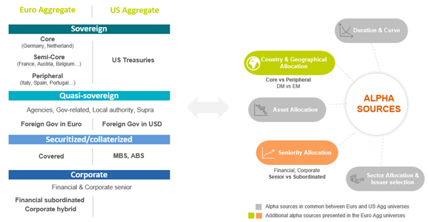 Eurodenominierte Anleihen stammen aus unterschiedlichen Ländern und Sektoren. Außerdem gibt es erst- und nachrangige Papiere. Das bietet Anlegern unabhängig vom Marktumfeld eine große Chancenvielfalt.
